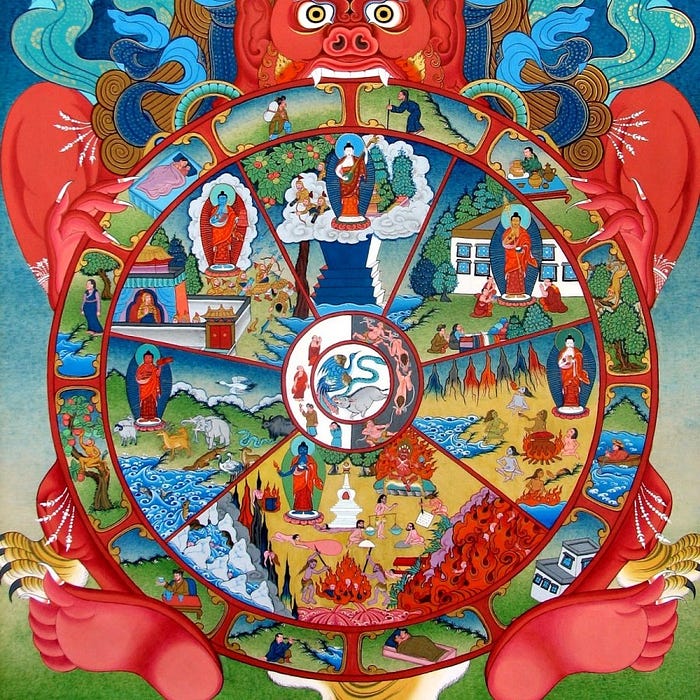 Samsara in Buddhism is the beginning-less cycle of repeated birth, mundane existence and dying again. It is considered to be unsatisfactory and painful, perpetuated by desire and ignorance, and the resulting karma. If you follow the Noble Eight-fold Path you can escape from the painful cycle of rebirth. Bhavachakra, the wheel of life (below), is a symbolic representation of the cyclic existence.