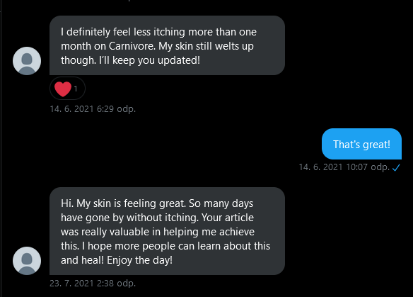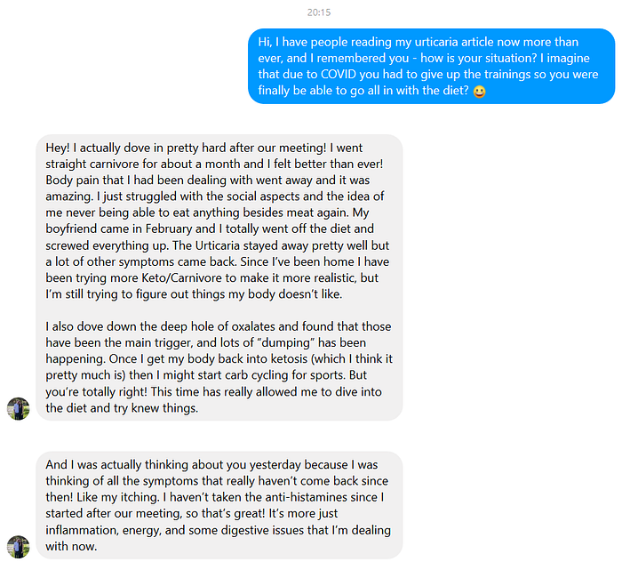 [edit 30th of May 2020:] 6 months ago a girl named Erica contacted me, telling me she found my article and she is currently in the Czech Republic due to an athletic team championship she is taking a part in (professional volleyball, hard training routines 6 days a week, calorie heavy diet). She wanted to talk about the illness so we met and talked for 5 hours about it. Turns out she has CIU and at first I couldn’t believe she had the same stuff I had AND she kept playing a sport such as volleyball, where the skin gets irritated constantly. Today I messaged her and it seems that the methods described here worked for her! See for yourself, I hope it will also give you some hope and motivation to go through with this diet: