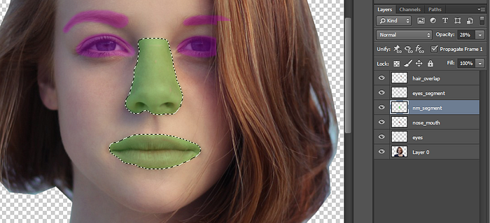 I am using layers for face segmentation. I simply brush paint the “nose and mouth” and then the “eyes and eyebrows” parts and then create a new PS layer for it. I do that by selecting the visible pixels (Ctrl+layer thumbnail click) and making a new layer from the selected. Any hair, glasses or other face cover goes into a layer named “hair_overlap”. I mark the segments for all of the 50 images.