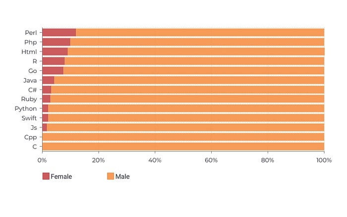 The Face API has the ability to detect gender from facial structure. The results here are quite one sided. AI and Webdev languages have at least some female energy.