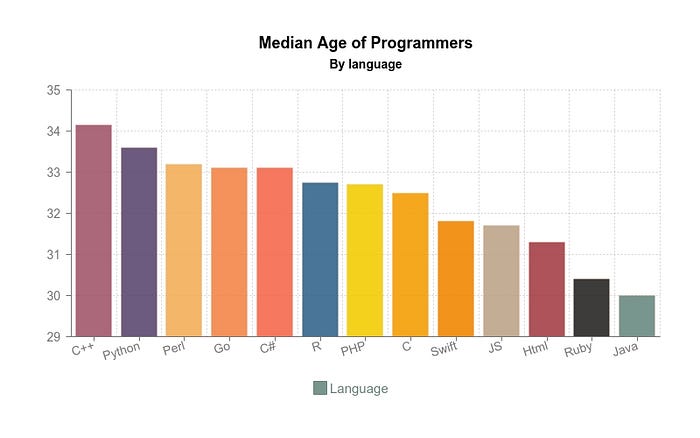 The age metric turned out to be interesting. Older languages should be presumably used by older programmers, but Java has the youngest devs.