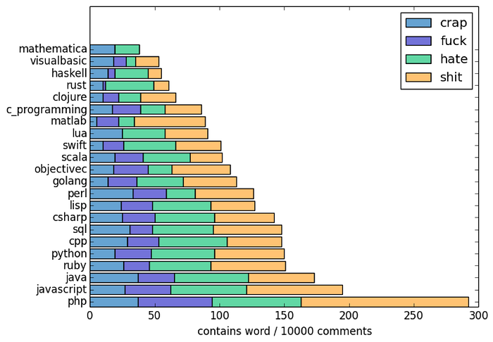 You will hear the most swearwords among the PHP communities (that comes as a no surprise I think). Second “best” is Javascript, followed by Java on the third place. Mathematical language devs seem to be at ease the most.