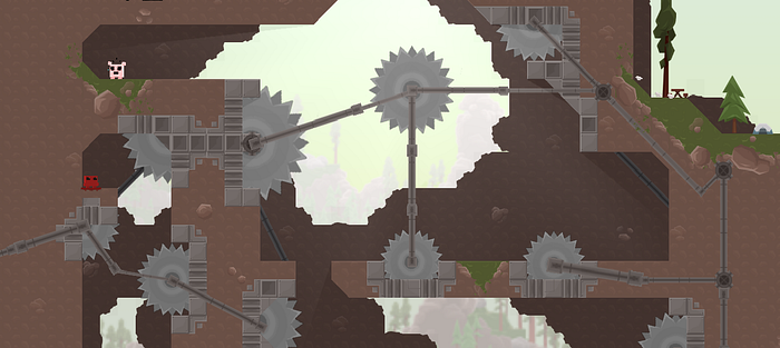 The game has a very clean feel, and many details that support the immersion. Squirrels run away from you and get killed by the saws, you leave a trail of meat juice behind and when you finish the level, you can replay all your attempts at beating the level along with all of your deaths.