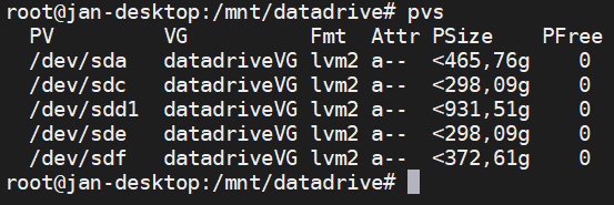 Just a bunch of HDDs in one big (2.3 TB) logical volume. That brings a big problem — if one of the drives fails, the whole logical volume gets corrupted.