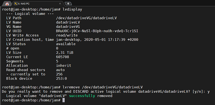 First I had to backup my data to another (external) drive. Then I unmounted the logical volume and deleted it.