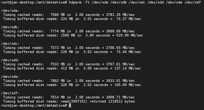 I found that 3 of the disks were full of errors and faults, so I chose only the sdd (WD 1TB) and sde (WD 320GB) drives, which also have the fastest read speeds (I didn’t test write speed, read speeds were enough for me as a benchmark). I’ve tested the read speeds with hdparm.