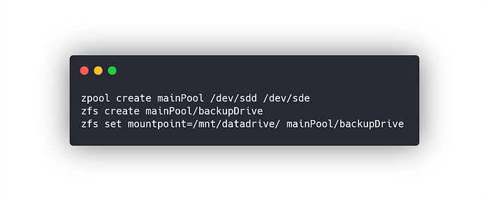 ZFS combined the features of a volume manager (like the LVM I used last time) and a file system. That means the filesystem can span across multiple drives or a pool.