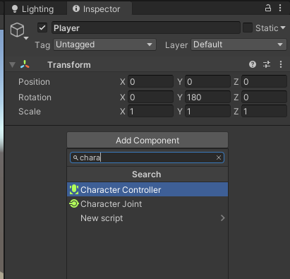 Now I need to add the Character controller to the Player object and edit the collider capsule to fit it.