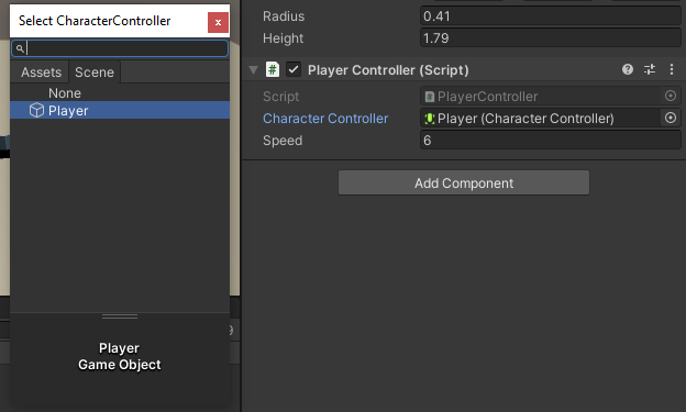 Next I assign the player controller to the player object and add the character controller.
