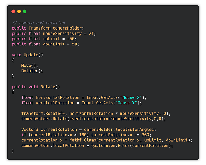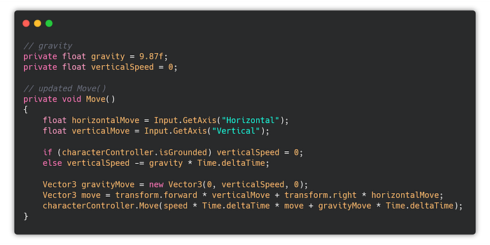 Another thing I need to add is gravity, so the character doesn’t stay floating after he steps on the stairs and also I need to add the walking animation, character rotation, and looking around with the mouse.