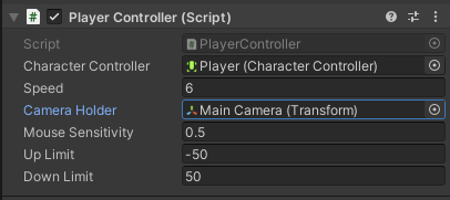 I also assign the Main Camera to the Camera Holder in the Player Controller script.