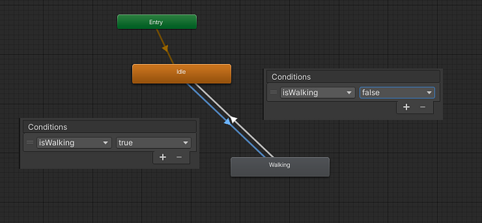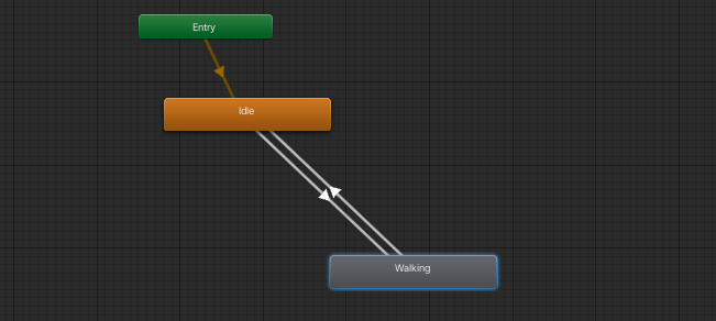 The final steps are the animations. The Animation Controller has two animations — Idle and Walking. I create back and forth transitions between them.