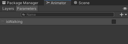 I add a new parameter isWalking in the Animator (the + button, new Bool):