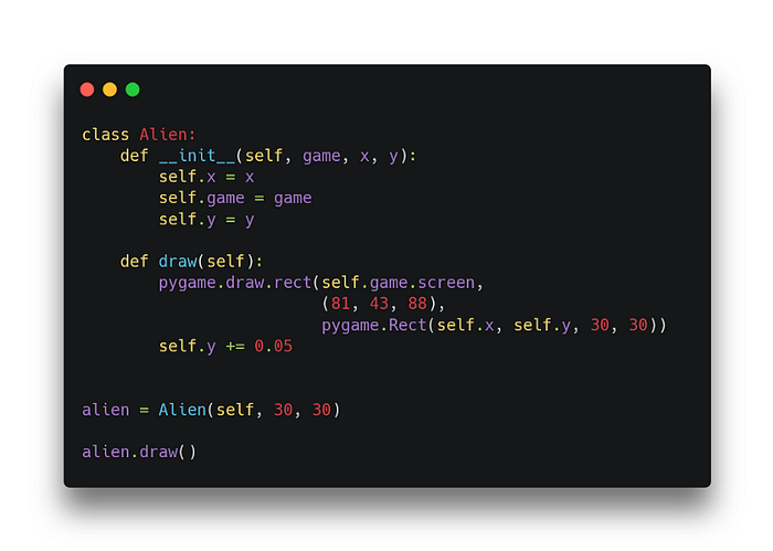 I create a new Alien class, that holds coordinates, color, and size and will draw the object to the screen. I set the “falling down” effect with the decreasing y value by 5% of a pixel per frame.