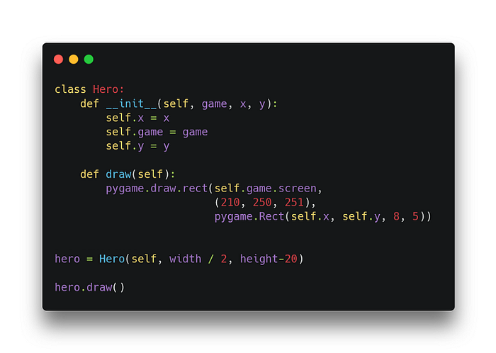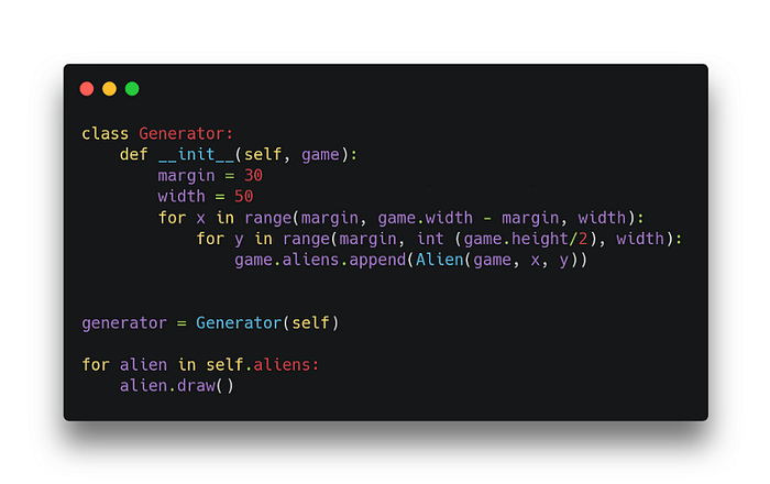 (the un-indented blocks of code are not going to work as you see them— alien = … and alien.draw need a “game” instance reference instead of self. Same goes for Hero and Generator below. For complete code see the end for a github link)