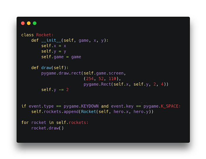 Now I add some rockets to the hero. The Rocket class is almost the same as Alien and Hero, only its vertical speed is 2 pixels per frame. When the player presses Space, a rocket is created in his position.