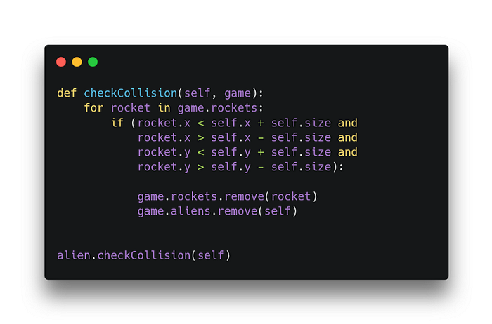 Now I check the collision of the rocket and the alien. Every alien iterates through all the available rockets and checks if any of them collided with his body. He destroys himself when it does.