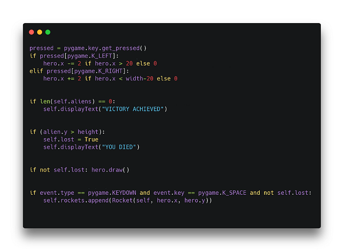 Last thing I add is the movement. Player can move right and left. I also set the win and lose conditions — if player destroys everyone, he wins. If any alien touches the ground, game ends.