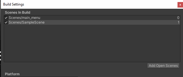 Go to File -> Build settings and the scenes you have to the “Scenes in Build”. My New Game scene is the SampleScene.