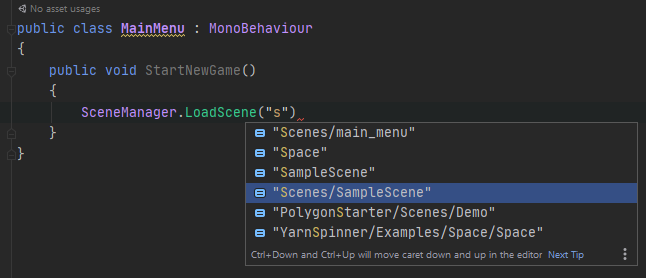In the script, use the SceneManager to load the scene in a new function that we will hook up to the button later.