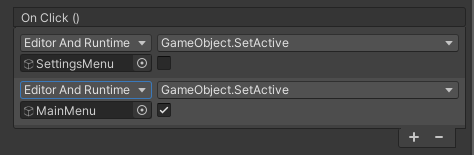 Add new OnClick functions to the SettingsButton (onclick hide the main menu and show the settings menu):