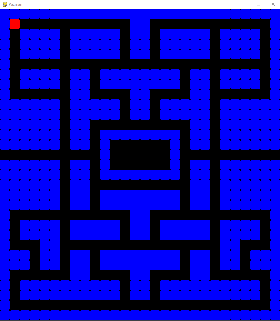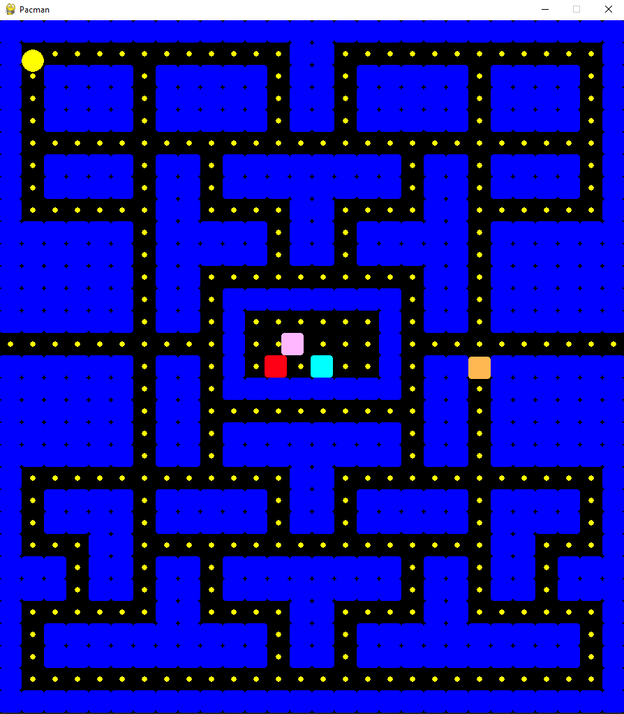 To add player functionality, I will create a class called Hero. Most of the logic for controlling both the player and the ghosts is handled in the MovableObject class, so we only need a few functions to specify the behavior of the player. In the original Pacman, the player can move in four directions, controlled by the arrow keys. If no arrow key is pressed, the player will continue in the last valid direction. If a key is pressed in a direction that the player cannot move, the direction is saved and used at the next available turn. I will replicate this behavior in our game and also added Pacman’s ability to teleport from one end of the maze to the other — I will just check if the player is outside the game area on the left or right side and set their position to the opposite side of the maze accordingly. Pacman also has a modified rendering function, we need to render it with half the size it would normally take up as a square (using pygame.rect).