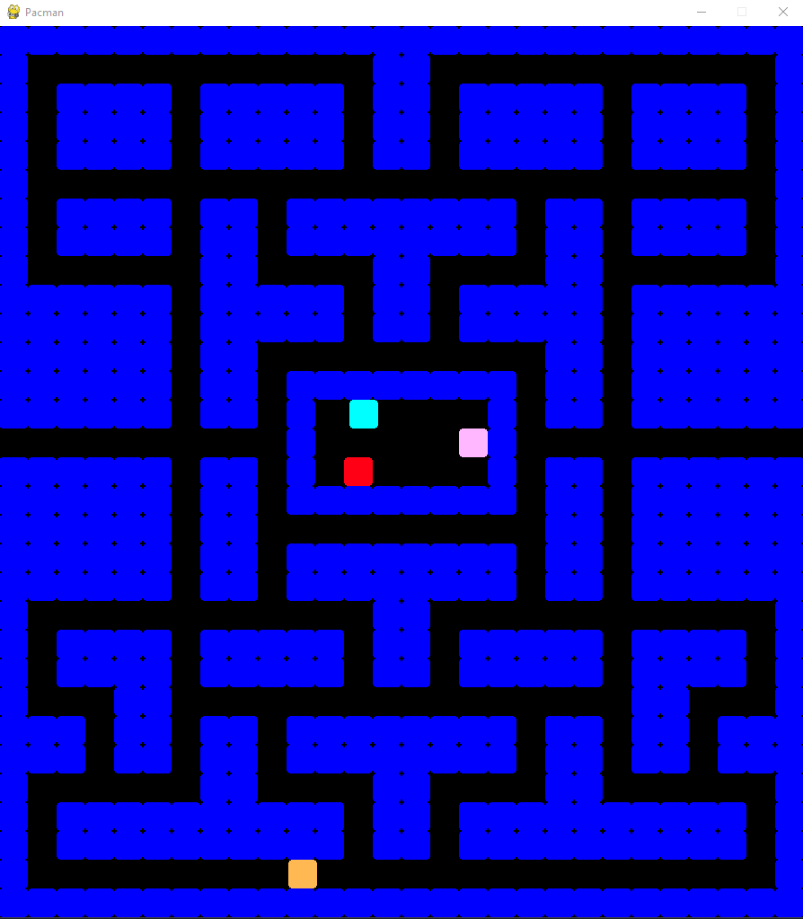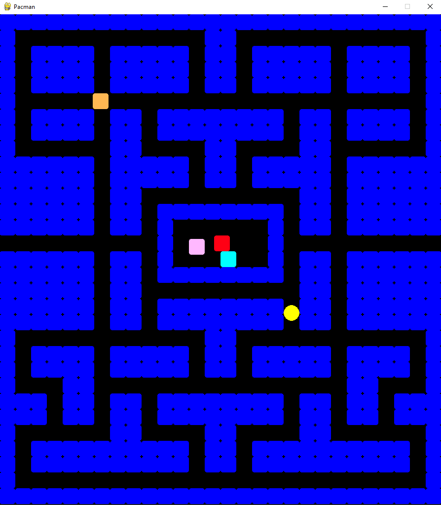 The ghosts are now created at the positions indicated by the letter “G” in the original ASCII maze and begin to search for a random path. I have locked three ghosts in the cage — as in the original Pacman, they will be released one by one — and one is wandering through the maze: